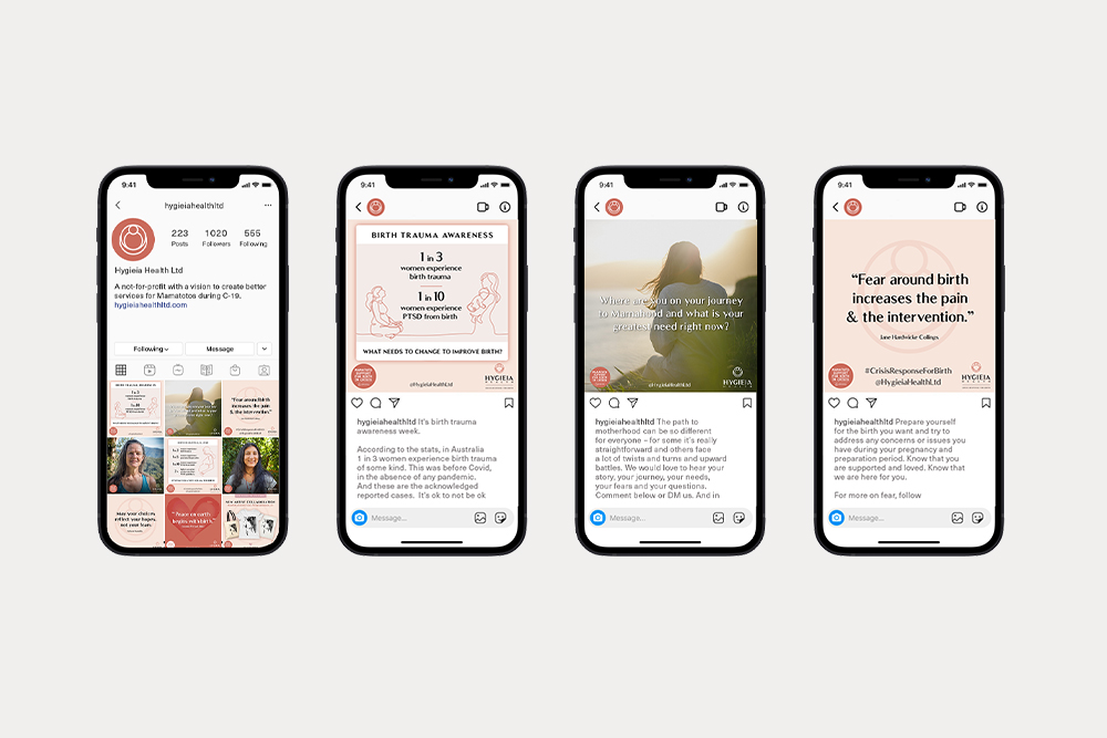We then worked closely & quickly with the team each week, to develop a social campaign to support the initial launch, and new campaigns to connect with those birthing & working in response to the changes made during the pandemic. And also fundraisers which involved creating merchandise for Hygieia Health.